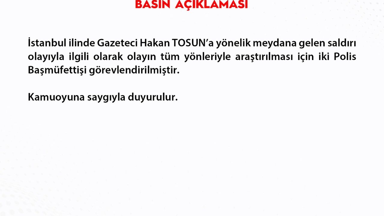EGM'den yapılan yazılı açıklamada, "İstanbul ilinde gazeteci Hakan Tosun'a yönelik meydana gelen saldırı olayıyla ilgili olarak olayın tüm yönleriyle araştırılması için 2 Polis Başmüfettişi görevlendirilmiştir" denildi.