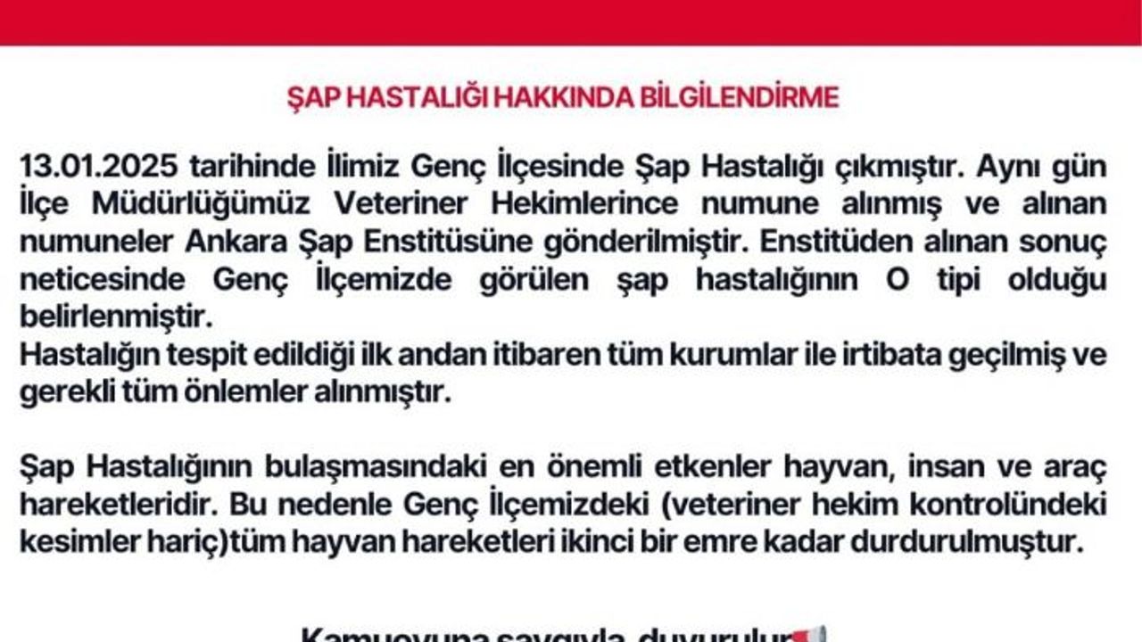 Bingöl İl Tarım ve Orman Müdürlüğü'nden yapılan açıklamada, "13 Ocak 2025 tarihinde ilimiz Genç ilçesinde şap hastalığı çıkmıştır. Aynı gün İlçe Müdürlüğümüz veteriner hekimlerince numune alınmış ve alınan numuneler Ankara Şap Enstitüsüne gönderilmiştir. Enstitüden alınan sonuç neticesinde Genç ilçemizde görülen şap hastalığının O tipi olduğu belirlenmiştir. Hastalığın tespit edildiği ilk andan itibaren tüm kurumlar ile irtibata geçilmiş ve gerekli tüm önlemler alınmıştır. Şap hastalığının en büyük belirtileri ağızda salya, ağız, dil ve ayaklarda oluşan yaralardır. Şap hastalığının bulaşmasındaki en önemli etkenler hayvan, insan ve araç hareketleridir. Bu nedenle Genç ilçemizdeki (veteriner hekim kontrolündeki kesimler hariç) tüm hayvan hareketleri ikinci bir emre kadar durdurulmuştur. Kesime gönderilen hayvanlar için her türlü temizlik ve dezenfeksiyon işlemleri kesimhaneyi de kapsayacak şekilde başlatılmıştır. Alınan sıkı tedbirler sonucunda hastalık çıktığı bölgede kontrol altına alınmış, ilimizde an itibarıyla başka bir bölgeye bulaşması engellenmiştir. Bu nedenle yetiştiricilerimizin panik yapmadan işletmelerine yabancı kişileri sokmamaları, kendilerinin de başka işletmelere girip çıkmamaları, hayvan alım-satımını durdurmaları veya alacaklarsa yeni aldıkları hayvanlarını diğer hayvanlarının içine katmadan en az 21 gün başka bir bölmede karantinada tutmaları, 21 gün sonunda hastalık belirtisi göstermedikleri takdirde hayvanlarının içine katmaları, ahır girişlerinde dezenfektan veya sönmemiş kireç bulundurmaları ve aşılama için gelen veteriner hekimlere yardımcı olup tüm hayvanlarını mutlaka aşılatmaları büyük önem arz etmektedir" denildi.