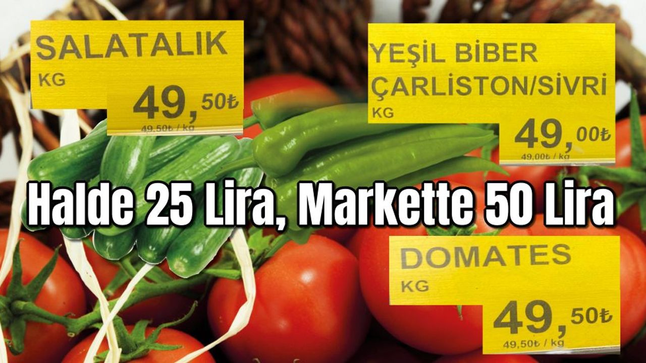 Ancak aynı ürünler zincir marketlerin reyonlarına ulaştığında fiyatlar neredeyse iki katına çıkıyor. Market etiketlerine yansıyan fiyatlar şu şekilde: Domates: 49,50 TL, Salatalık: 49,50 TL, Çarliston Biber: 49,00 TL