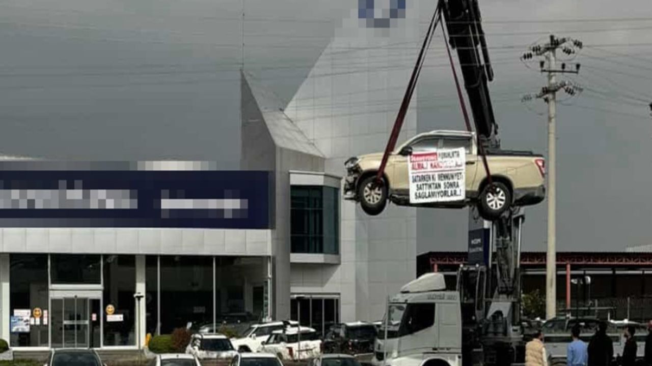 Olay, Kavaklı Mahallesi Turhan Cemal Beriker Bulvarı’nda bulunan bir otomobil bayisinde meydana geldi. Sıfır kilometre olarak satın aldığı kamyonetin hatalı olduğunu öne süren kişi, bayi yetkililerinin zararını gidermemesi üzerine eylem yaptı. Aracı vinçle bayinin önüne taşıtıp, yükseğe kaldırtan kişi, üzerine 'Alma, kandırılma. Satarken gösterilen memnuniyet, satıştan sonra sağlanmıyor' yazılı pankart asarak sergiledi. Yaşananlar, çevredekiler tarafından cep telefonuyla görüntülendi. Bayi yetkilileriyle bir süre görüşen kişi, daha sonra eylemini sonlandırarak kamyonetini vinçten indirip bölgeden ayrıldı.