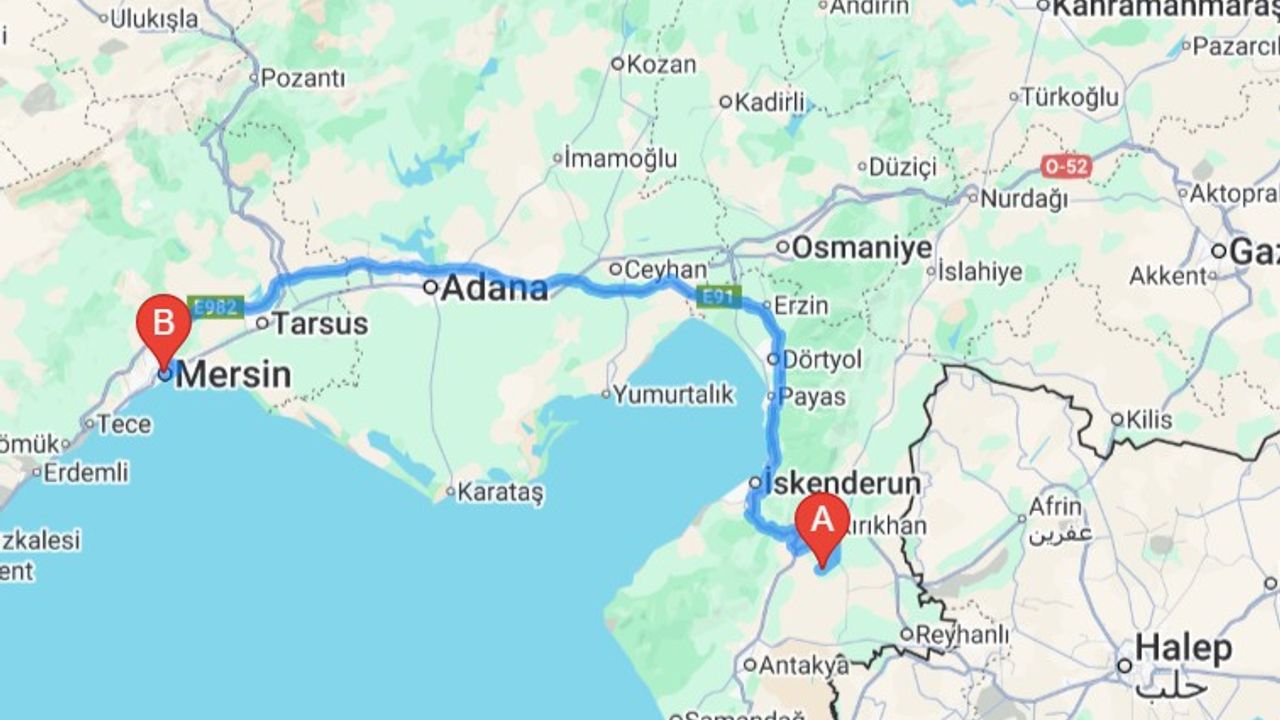 Yapılan navigasyon verilerine göre, Hatay ile Mersin arasındaki ana güzergâh karayolu ile: