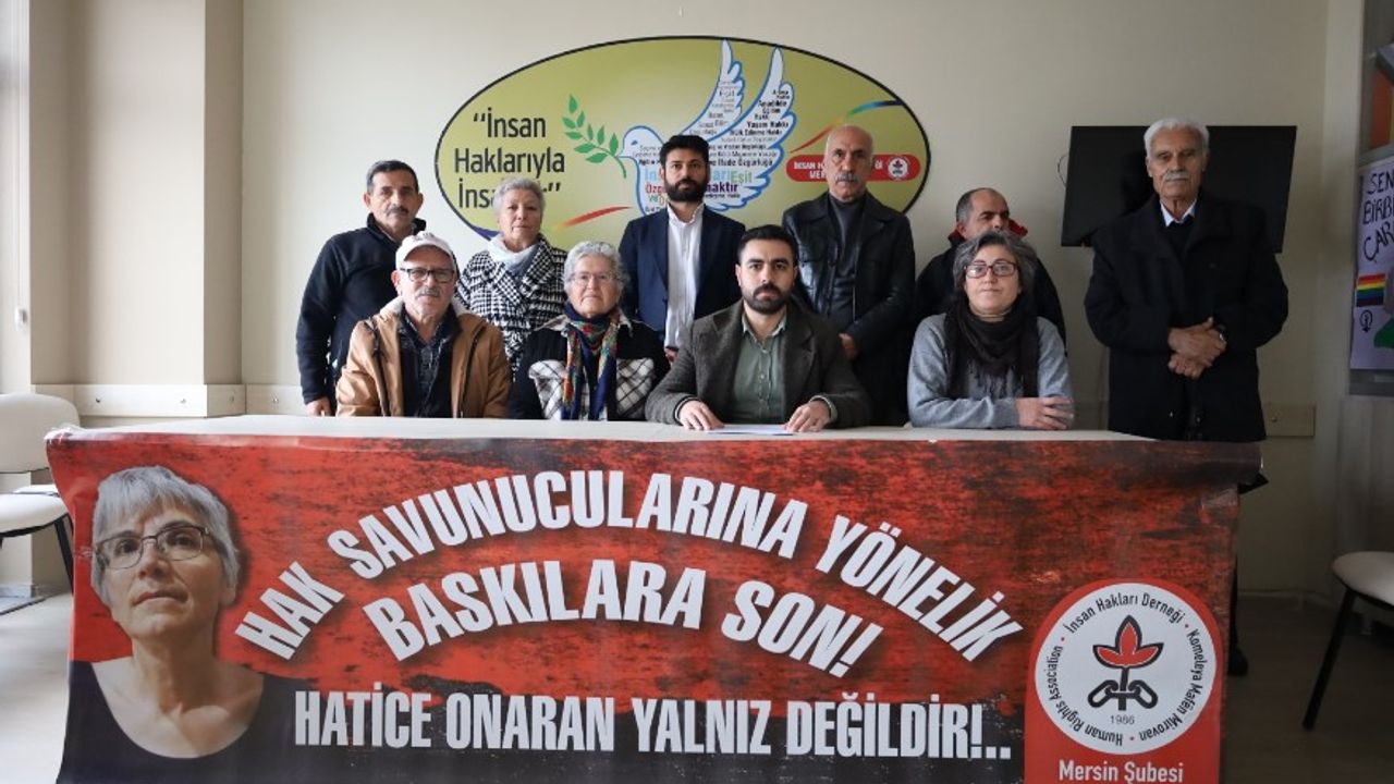 İHD Mersin Şubesi'nde basın açıklaması yapan insan hakları savunucuları, tutuklu bulunan Hatice Onaran'ın bırakılmasını istedi. Burada açıklama yapan İHD Mersin Hapishane Komisyon Sözcüsü Muammer Derince, insan hakları savunucusu Hatice Onaran'ın 2024 yılının Ekim ayından bu yana Gebze Kadın Kapalı Hapishanesinde yattığını belirterek, "Hatice Onaran hakkında İstanbul 13. Ağır Ceza Mahkemesi tarafından 'Terörizmin Finansmanının Önlenmesi Hakkındaki Kanuna Muhalefet' iddiasıyla yargılama gerçekleştirilmiş ve 4 yıl 2 ay hapis cezası verilmiştir. Hatice Onaran, uzun yıllardır insan hakları mücadelesi yürüten ve İnsan Hakları Derneği (İHD) İstanbul Şubesi Hapishane komisyonun aktif bir üyesidir. Hatice arkadaşımız barışçıl ve meşru insan hakları faaliyetleri kapsamında hasta ve yoksul mahpuslarla sürekli dayanışma içerisinde olmuş; mahpusların temel ihtiyaçlarının