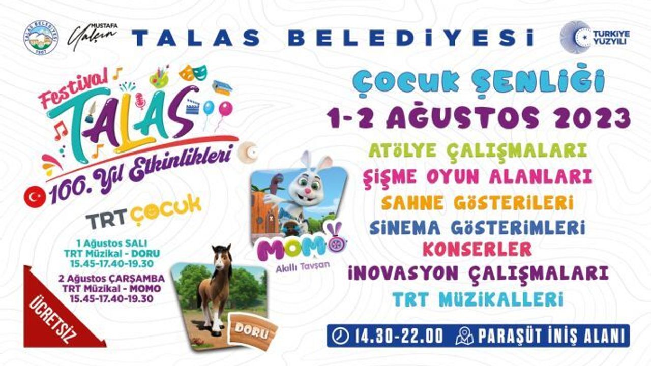 1-2 Ağustos tarihlerinde Talas Paraşüt İniş Alanı'nda gerçekleştirilecek şenlikte çocuklar ve aileleri dolu dolu 2 gün geçirecek. Atölye çalışmalarından sahne gösterilerine, sinema gösterimlerinden konserler ve TRT müzikallerine kadar birçok aktivitenin çocuklarla buluşacağı organizasyonda ayrıca şişme oyun alanındaki birbirinden keyifli oyunlar çocukları bekliyor olacak. Tamamı ücretsiz olacak etkinlikler, 1 Ağustos Salı ve 2 Ağustos Çarşamba günü saat 14.30'da başlayacak ve 22.00'ye kadar devam edecek. Konuya ilişkin bir değerlendirme yapan Talas Belediye Başkanı Mustafa Yalçın; Cumhuriyetin 100 yılını kutladıklarına dikkat çekerek; "Cumhuriyetimiz 100 yaşında ve biz bunun gururunu yaşıyoruz. Bununla birlikte 100. yılı anlamlı kılmak ve coşkulu şekilde kutlamak amacıyla birçok etkinlik ve açılış planladık. Bu çerçevede birbirinden önemli tesis ve yatırımları hizmete açacağız. Bununla birlikte her yaşa ve her kesime hitap eden organizasyonlarımız olacak. 1 ve 2 Ağustos'ta çocuklarımız için iki günlük bir şenlik düzenliyoruz. Hem gönüllerince eğlenecekler hem de bilgi sahibi olacaklar. Bugüne kadar düzenlenmiş en gelişmiş çocuk şenliği için tüm çocuklarımızı ve ailelerini, Paraşüt İniş Alanına bekliyoruz" dedi.