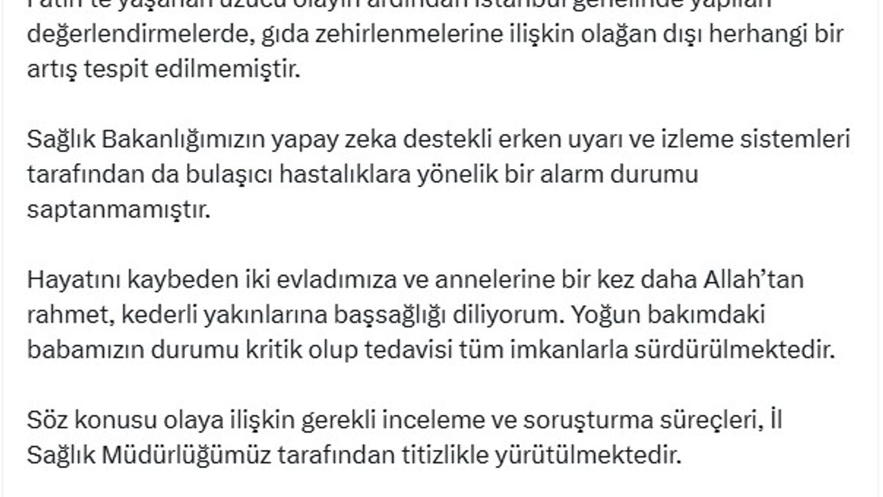 İstanbul İl Sağlık Müdürü Doç. Dr. Abdullah Emre Güner, kentteki gıda zehirlenmelerine ilişkin sosyal medya hesabından açıklamada bulundu. Güner, "Fatih’te yaşanan üzücü olayın ardından İstanbul genelinde yapılan değerlendirmelerde, gıda zehirlenmelerine ilişkin olağan dışı herhangi bir artış tespit edilmemiştir. Sağlık Bakanlığımızın yapay zeka destekli erken uyarı ve izleme sistemleri tarafından da bulaşıcı hastalıklara yönelik bir alarm durumu saptanmamıştır. Hayatını kaybeden iki evladımıza ve annelerine bir kez daha Allah’tan rahmet, kederli yakınlarına başsağlığı diliyorum. Yoğun bakımdaki babamızın durumu kritik olup tedavisi tüm imkanlarla sürdürülmektedir. Söz konusu olaya ilişkin gerekli inceleme ve soruşturma süreçleri, İl Sağlık Müdürlüğümüz tarafından titizlikle yürütülmektedir. Kamuoyuna saygıyla duyurulur" ifadelerini kullandı.