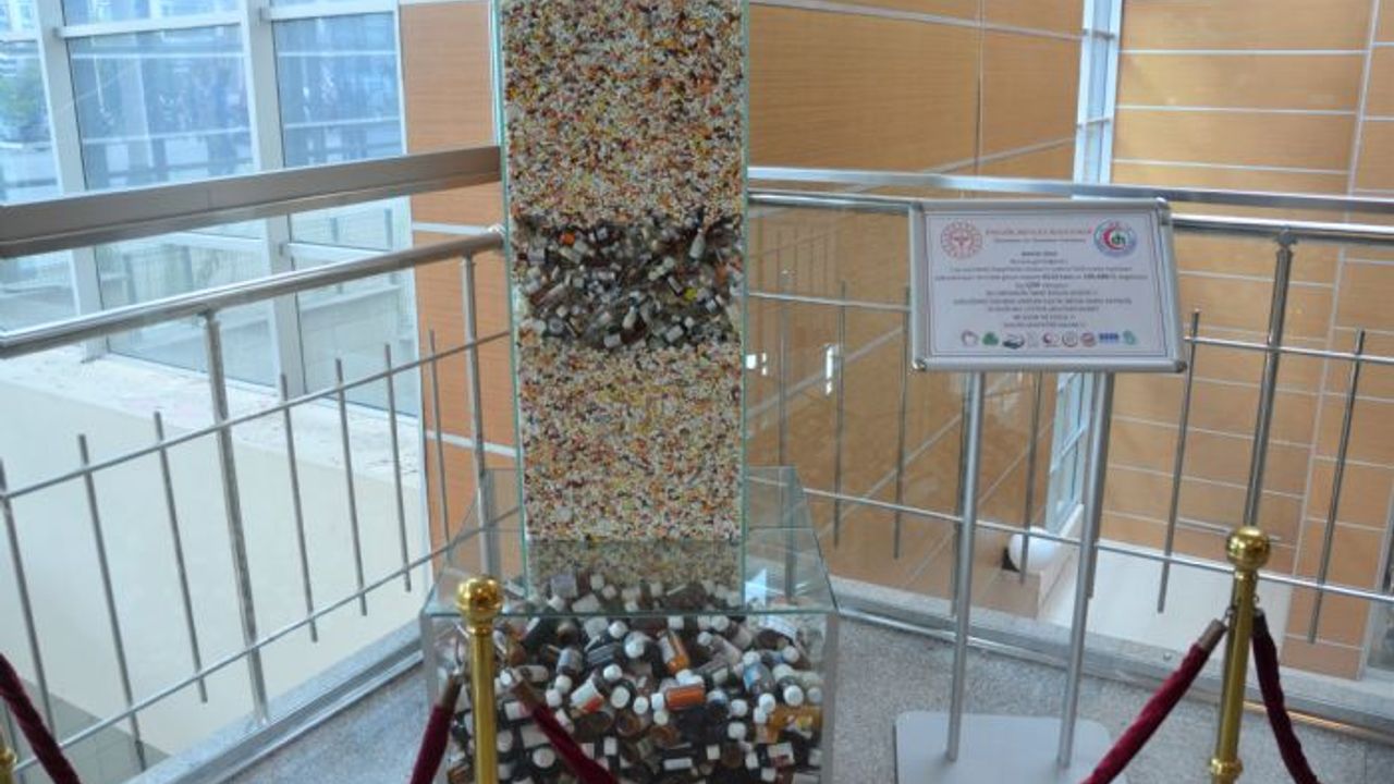 İnegöl Devlet Hastanesi'nde akılcı ilaç kullanımına dikkat çekmek için yapılan bir projede toplanan ilaçlar, her gün tedavi için gelen yüzlerce hastanın dikkatini çekiyor.