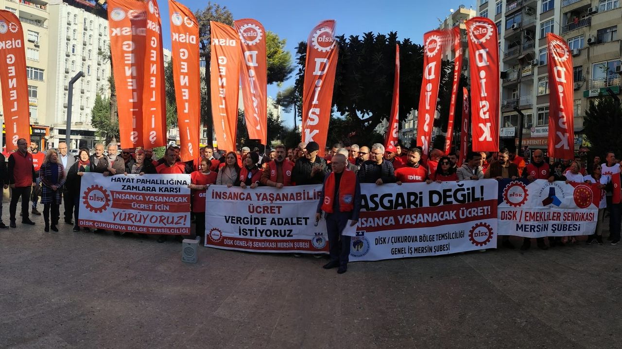 Genel-İş Sendikası Mersin Şube öncülüğünde Özgür Çocuk Parkı'nda bir araya gelen emekçiler, attıkları sloganlarla ve yaptıkları basın açıklamasıyla haklarını istedi. Burada grup adına açıklama yapan DİSK Çukurova Bölge Temsilcisi ve Genel-İş Sendikası Mersin Şube Başkanı Kemal Göksoy, Hayat pahalılığı karşısında ücretlerin eridiğini, alım gücünün her gün daha da düştüğünü belirterek, "Ücret artışları, TÜİK'in açıkladığı ama kimsenin inanmadığı resmi enflasyonun bile altında kalıyor. Bugün ülkemizin en büyük sorunu bölüşüm sorunu. Bu düzenin bütün çarkları zengini daha zengin, yoksulu daha yoksul yapmak için dönüyor. Bizler örgütlü işçiler, örgütleniyoruz, mücadele ediyoruz, haklarımızı söke söke alıyoruz. Ama ne oluyor: Hayat pahalılığı karşısında ücretlerimiz eriyor, alım gücümüz her gün daha da düşüyor. Şimdi önümüzde asgari ücret gündemi var. Ülkemizde işçilerin büyük bölümü asgari ücret civarında ücret alıyor. Evet; biz örgütlü işçiler asgari ücret almıyoruz. Ama biliyoruz ki asgari ücret tüm ücretleri beliriyor, tüm toplu sözleşmeleri etkiliyor. Asgari ücret ise açlık sınırının dahi altında kalıyor. Açlık sınırı 30 bin liraya dayandı; yoksulluk sınırı 90 bin lirayı çoktan geçti ama asgari ücret 22 bin 104 lira. Üstelik asgari ücretin 11 aylık kaybı 6 bin 574 liraya dayandı. Enflasyonla her gün eriyen asgari ücretin bugün alım gücü 16 bin liraya gerilemiş durumda. 2025'te yapılan asgari ücret artışı, 2024'te yaşanan kayıpları bile telafi etmedi, yüzde 15 geride kaldı. Üstüne yüksek devam eden 2025 enflasyonu ile asgari ücret eridi gitti. Ülkeyi yönetenler, yüksek enflasyona rağmen yıl boyunca asgari ücreti artırmadı. Bugün bir ailede anne, baba ve iki çocuk çalışsa bile eve giren gelir yoksulluk sınırının altında kalıyor. Ülkeyi yönetenler hep aynı masalı anlatıyor. 'Düşük ücret alırsanız, enflasyon düşer( diyorlar. Ama gerçekte yaşanan farklı. Hükümet enflasyonu değil ama ücretleri düşürüyor" dedi.