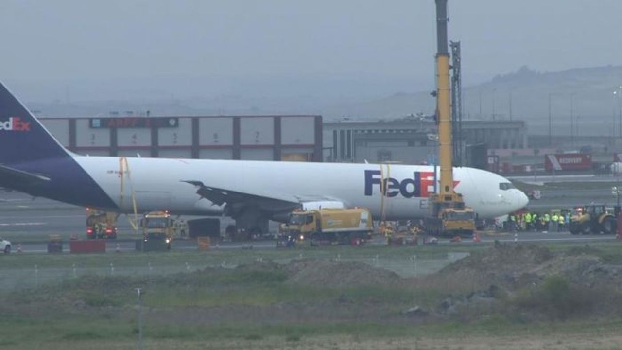 İstanbul Havalimanı'nda Fedex Havayolları'na ait kargo uçağı, ön iniş takımları açılmayınca gövdesi üzerine piste iniş yaptı.