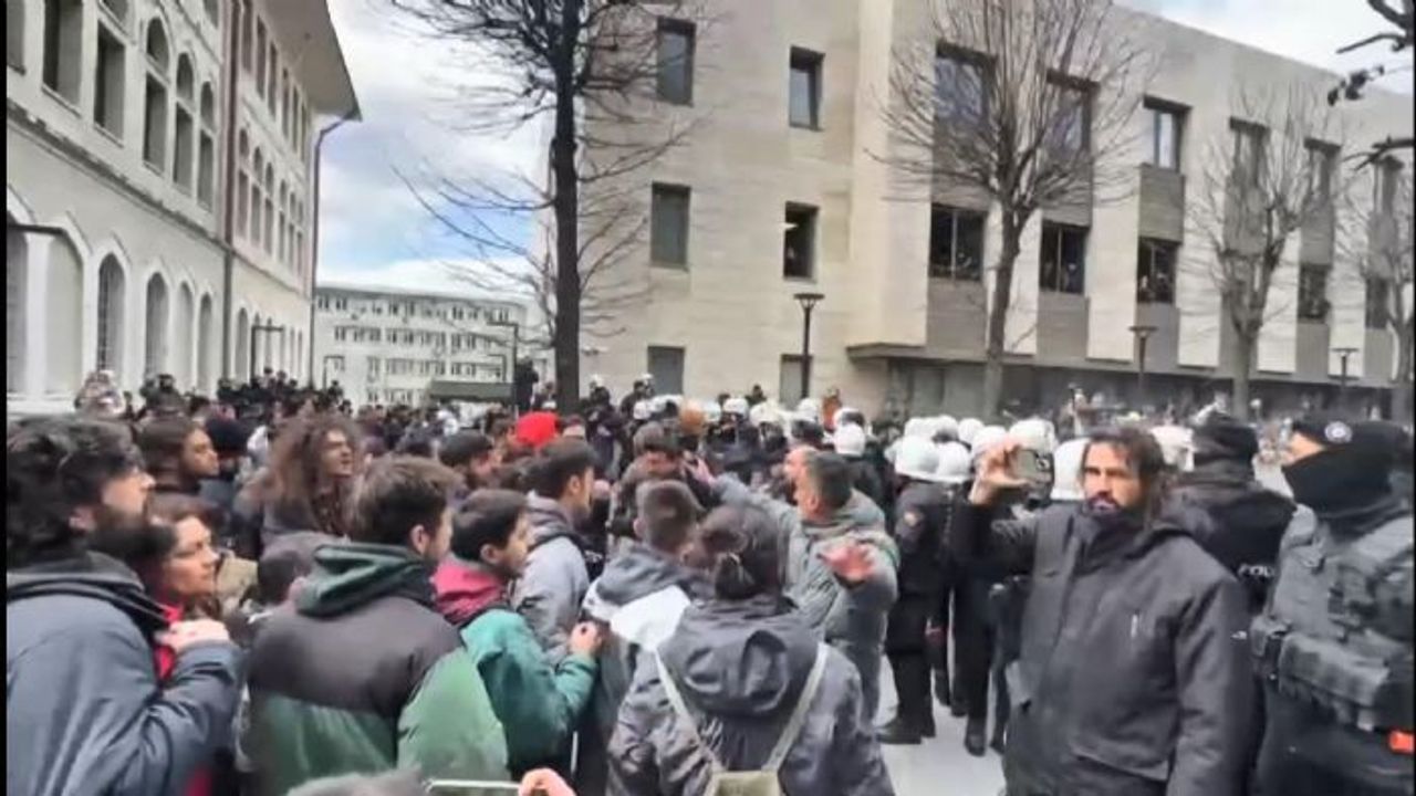 İstanbul Üniversitesi'nin, dün aldığı diploma iptali kararının ardından, bu sabaha karşı 'CHP'de para sayma görüntüleri' ve 'Kent uzlaşısı' soruşturmaları kapsamında İBB Başkanı Ekrem İmamoğlu, Murat Ongun, Tuncay Yılmaz, Fatih Keleş, Ertan Yıldız, Şişli Belediye Başkanı Resul Emrah Şahan, İBB Genel Sekter Yardımcısı Mahir Polat, Reform Enstitüsü Başkanı Mehmet Ali Çalışkan'ın da aralarında olduğu 106 şüpheli hakkın gözaltı kararı verilmesinin ardından İstanbul Üniversitesi önünde biraraya gelen bazı öğrenciler izinsiz yürüyüş yapmak istedi. Gruptakilere polis müdahale ederken, öğrenciler bir süre İstanbul Üniversitesi'nin ana kapısı önünde bekledi.