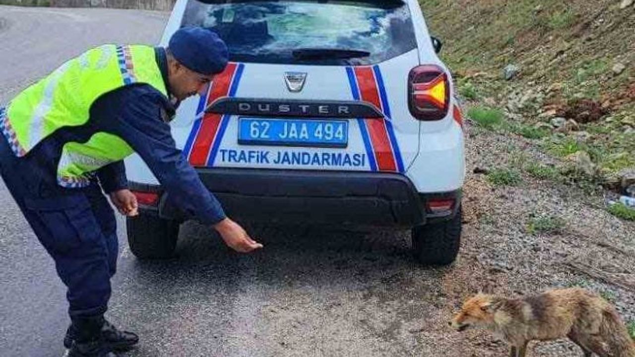 Erzincan - Tunceli kara yolunun 12'nci kilometresinde seyir halinde olan 4. trafik jandarma timi ekibinin karşısına tilki çıktı. Ekip, yanlarına kadar gelen ve aç olan tilkiyi yanlarında bulunan yiyecekle elleri ile besledi.