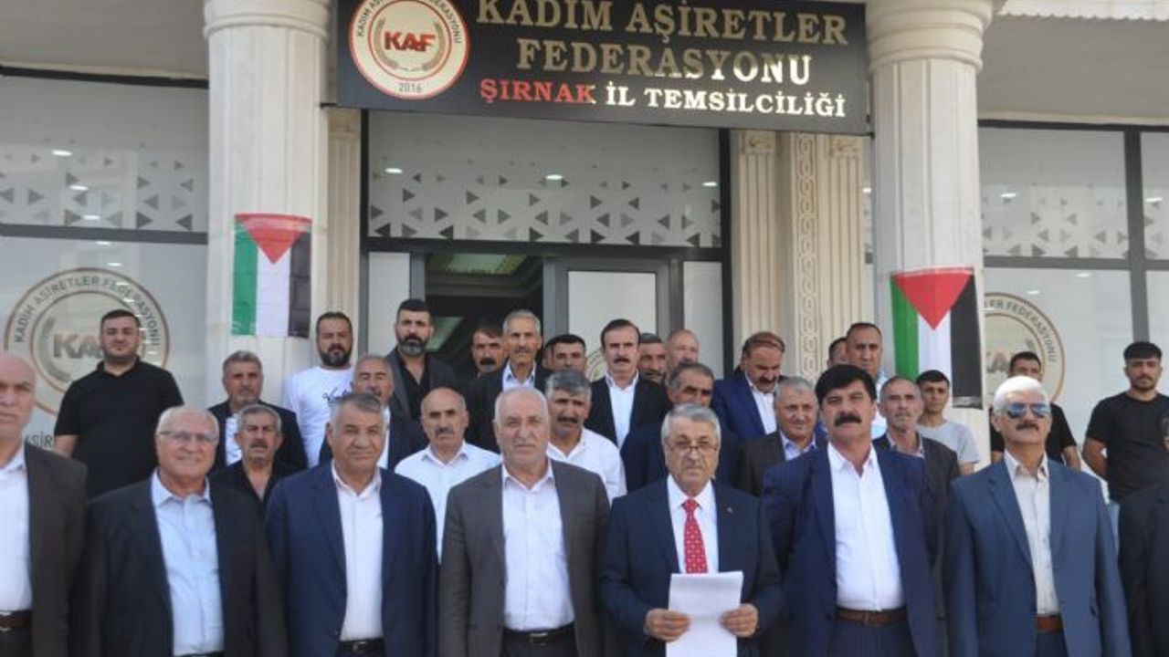 Cizre ilçesinde faaliyet gösteren Kadim Aşiretler Federasyonu (KAF) Şırnak İl Temsilciliği önünde toplanan federasyon üyeleri, İsrail'in Gazze ve Filistin'e yönelik saldırılarına yaptıkları basın açıklaması ile tepki gösterdi.