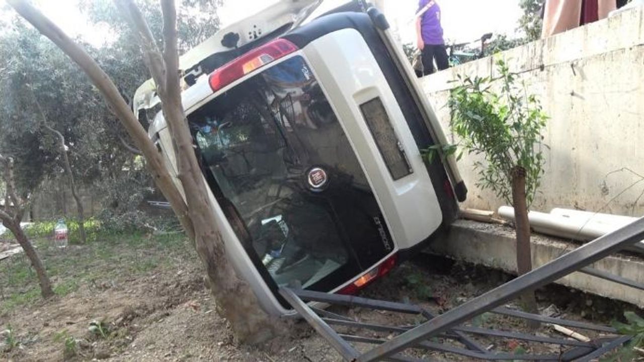 Antalya'nın Alanya ilçesinde hafif ticari araç ile otomobilin karıştığı kazada ticari araç, yol kenarındaki evin bahçesine uçtu.