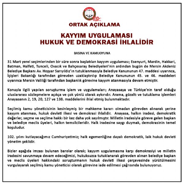 Barolar olarak; kayyım uygulamasına karşı demokrasiyi ve milletin iradesini savunmaya devam edeceğimizi, hukuksuzca tutuklanarak görevden alınan belediye başkan ve meclis üyeleri hakkındaki soruşturmanın hukuk devleti ilkesi çerçevesinde yürütülmesini vurgulayarak, seçilmiş kamu yöneticisi olarak görevine iade edilmesi çağrısında bulunuyoruz."