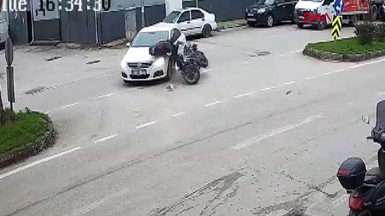 Kaza, saat 16.30 sıralarında Osmangazi ilçesi Küçükbalıklı Mahallesi’nde meydana geldi. Otomobil sürücüsü, yol kenarında durduktan sonra sinyal vermeden U dönüşü yapıp, karşı şeride geçmek istedi. Bu sırada aynı yönden gelen motosiklet otomobile çarptı. Önce otomobilin ön kaportasının üstüne ardından da yere düşen motosiklet sürücüsü yaralandı. Yerden kalkıp, olası bir yangın riskine karşı kontağı kapatan yaralı sürücü, kazanın şokuyla başındaki kaskı çıkarıp refüje doğru yürüdü. Otomobilinden inen sürücü ise yaralıya yardım etmek yerine aracındaki hasara baktı. O anlar, çevredeki bir iş yerinin güvenlik kamerasına yansıdı.