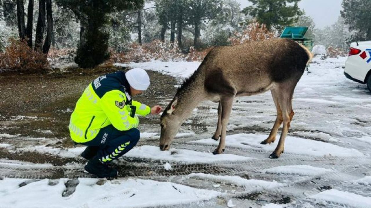 Eşeler Yaylası'na salınan kızıl geyiklerden biri, Yeşilova ilçesindeki Salda Kayak Merkezi yakınlarında karla mücadele çalışması yürüten jandarma trafik ekiplerinin yanına kadar yaklaştı. O anlar renkli görüntülere sahne olurken, ekipler bu beklenmedik ziyaret karşısında hayvanın sakinliğine hayran kaldı.