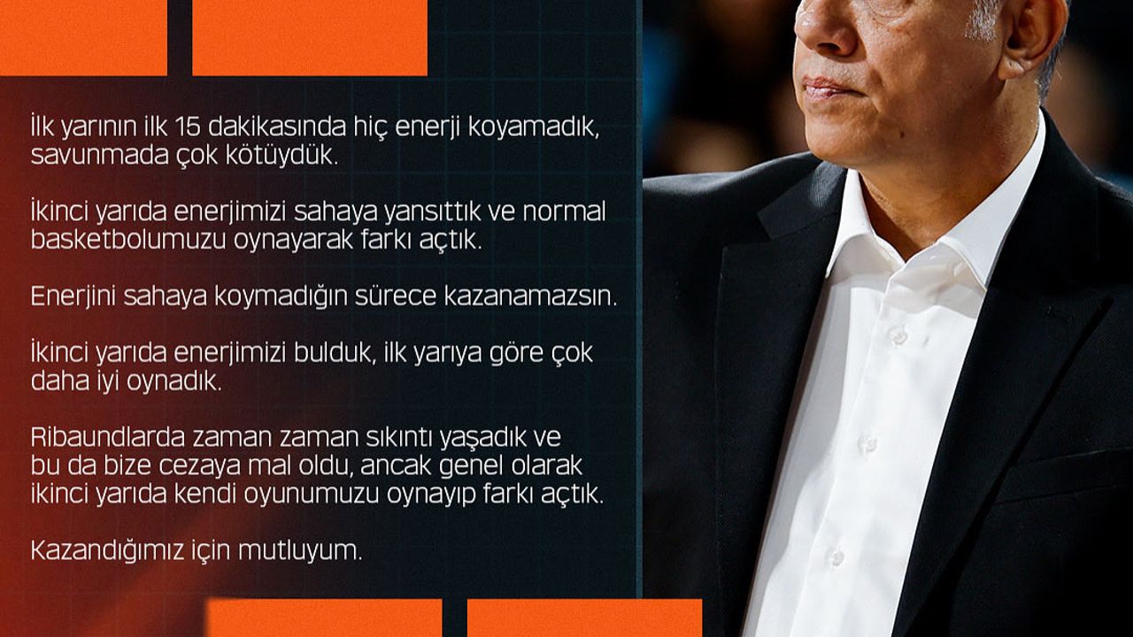 Dikeoulakos, "İkinci yarıda ihtiyacımız olan enerjiyi bulmayı başardık ve kendi basketbolumuzu oynamaya başladık" ifadelerini kullandı. Koç, sahada yüksek enerji olmasının önemine vurgu yaptı.