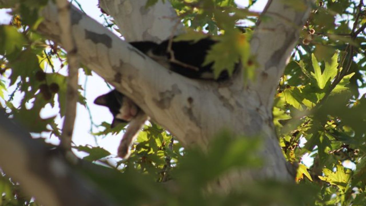 Kozan'da Şevkiye Mahallesi Adana Caddesi'ndeki meşe ağacında bir kedinin 8 saat boyunca mahsur kaldığını gören vatandaşlar, polise ve itfaiye ekiplerine haber verdi.