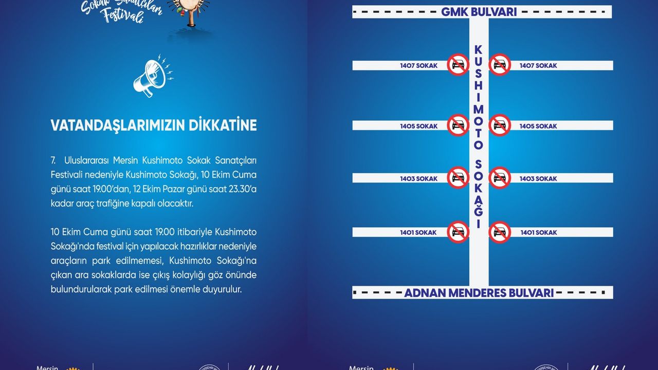 Festival hazırlıkları kapsamında Kushimoto Sokağı, 10 Ekim Cuma günü saat 19.00’dan itibaren araç trafiğine kapatılacak. Sokağın 12 Ekim Pazar günü saat 23.30’a kadar kapalı kalacağı, sürücülerin bu tarihler arasında araçlarını park etmemeleri gerektiği duyuruldu. Ayrıca, Kushimoto Sokağı’na çıkan ara sokaklarda da park düzenine dikkat edilmesi ve çıkış kolaylığının gözetilmesi istendi.