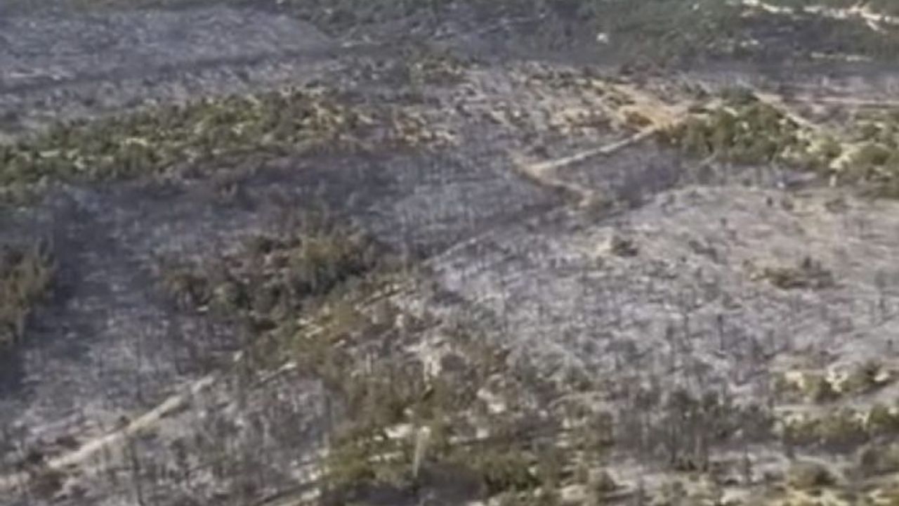 Yangında zarar gören 35 hektarlık ormanlık alan havadan görüntülendi.