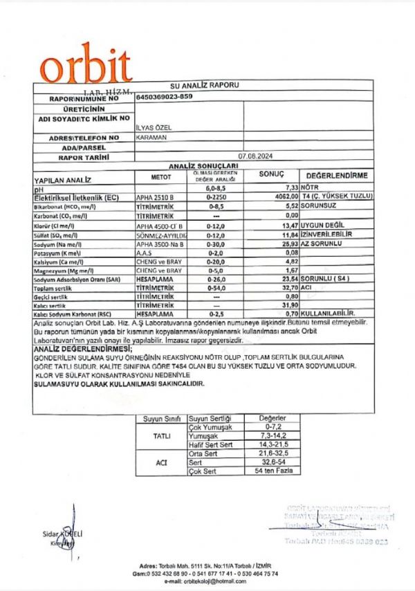Üretici Osman Özel, geçmiş yıllara göre bahçesinin bu yıl hiç hoşuna gitmediğini anlatarak, "Komşu çiftçimiz tarlasına iki kez fasulye ekti, hiç verim alamadı. Daha sonra kuyusunun suyunu tahlil ettirdi ve suda yoğun tuz çıktı. Bunun üzerine biz de şüphelendik ve aynı yere kuyumuzun suyunu tahlile gönderdik. Tahlil sonucunda bizim suyun da aynı şekilde tuz oranı yüksek çıkarak, tarıma elverişli değil raporu geldi" diye konuştu.