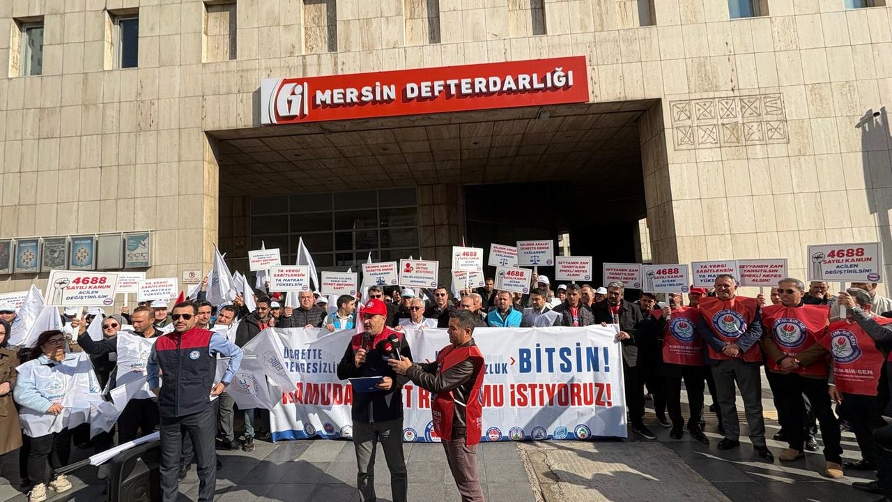 Mersin Defterdarlığı önünde bir araya gelen memurlar, maaş zamlarına tepki gösterdi. Yılın ilk maaş gününde eylem yapan memurlar, attıkları sloganlarla haklarını istedi. Grup adına açıklama yapan Memur-Sen Mersin İl Temsilcisi Ertuğrul Yıldız, bugün 2026 yılının ilk maaş günü olduğunu belirterek, "Bugün kamu görevlileri olarak, Memur-Sen ailesi olarak 'ücrette dengesizlik, gelirde adaletsizlik, kamuda huzursuzluk bitsin' diye Türkiye'nin 81 ilinde meydanlardayız. Kamu İşvereni ve hakem heyetinin 7. ve 8. Dönem Toplu Sözleşmelerde memurlara reva gördüğü zam rakamlarıyla sadece memuru enflasyona ezdirmekle kalmadı aynı zamanda kamu personeli arasındaki ücret dengesini de tamamen bozdu. Aynı ücret çarpıklığı 2023 yılında da yaşandı. Ancak Cumhurbaşkanımız, o dönemde bu çarpıklığı gördü ve gereğini yaptı. En düşük memur maaşını en düşük işçi maaşının üzerine çıkardı. Şimdi sistem tekrar alt-üst oldu, emeğimiz, memuriyet için okuduğumuz okullar, girdiğimiz sınavlar, döktüğümüz akıl teri yok sayıldı. Kamuda iş barışı ve huzurumuz bozuldu, memurlar olarak şevkimiz kırıldı. Aynı odada birlikte çalıştığımız, farklı statüde olan mesai arkadaşlarımızla aramızdaki uçurumu işveren hakem heyeti gösterdikleri tutum ve verdikleri kararla adaletsizliği derinleştirmeyi tercih ettiler. Ücretlerdeki dengesizlik ve gelirdeki adaletsizlik artık görmezden gelinemez bir noktaya geldi. Bu aşamadan sonra kamuda yaşanan huzursuzluğu artık kimse görmedim, duymadım. bilmiyorum diyemez. Bu çarpıklık derhal ve kalıcı olarak düzeltilmeli, kamuda iş barışı ve huzuru yeniden tesis edilmelidir. Bu yap-boz sisteminden artık vazgeçilmeli, 2 yılda bir sistemi bozan anlayıştan dönülmelidir. Biz Memur -Sen olarak diyoruz ki kamudaki bu çarpıklık, parçaca düzenlemelerle değil ancak bütüncül bir düzenlemeyle, belirli kesimleri kapsayan, kamu görevlilerinin bütününün sesini duymayan ve beklentisini karşılamayan tekil düzenlemeler ancak çarpıklığı derinleştirir, hoşnutsuzluğu büyütür. Memuru ezerek enflasyonla mücadele yürütülemez diyoruz. Sebebi olmadığınız enflasyonun faturasını sabit gelirliler olarak bizlere çıkarılmasını asla kabul etmiyoruz. Maliye Bakanlığı bu adaletsiz anlayıştan, enflasyonla mücadele sürdürülen bu çarpık yöntemden vazgeçmelidir. Adil paylaşım anlayışıyla hareket edilmeli, emeğin hakkı tamamen verilmelidir" dedi.