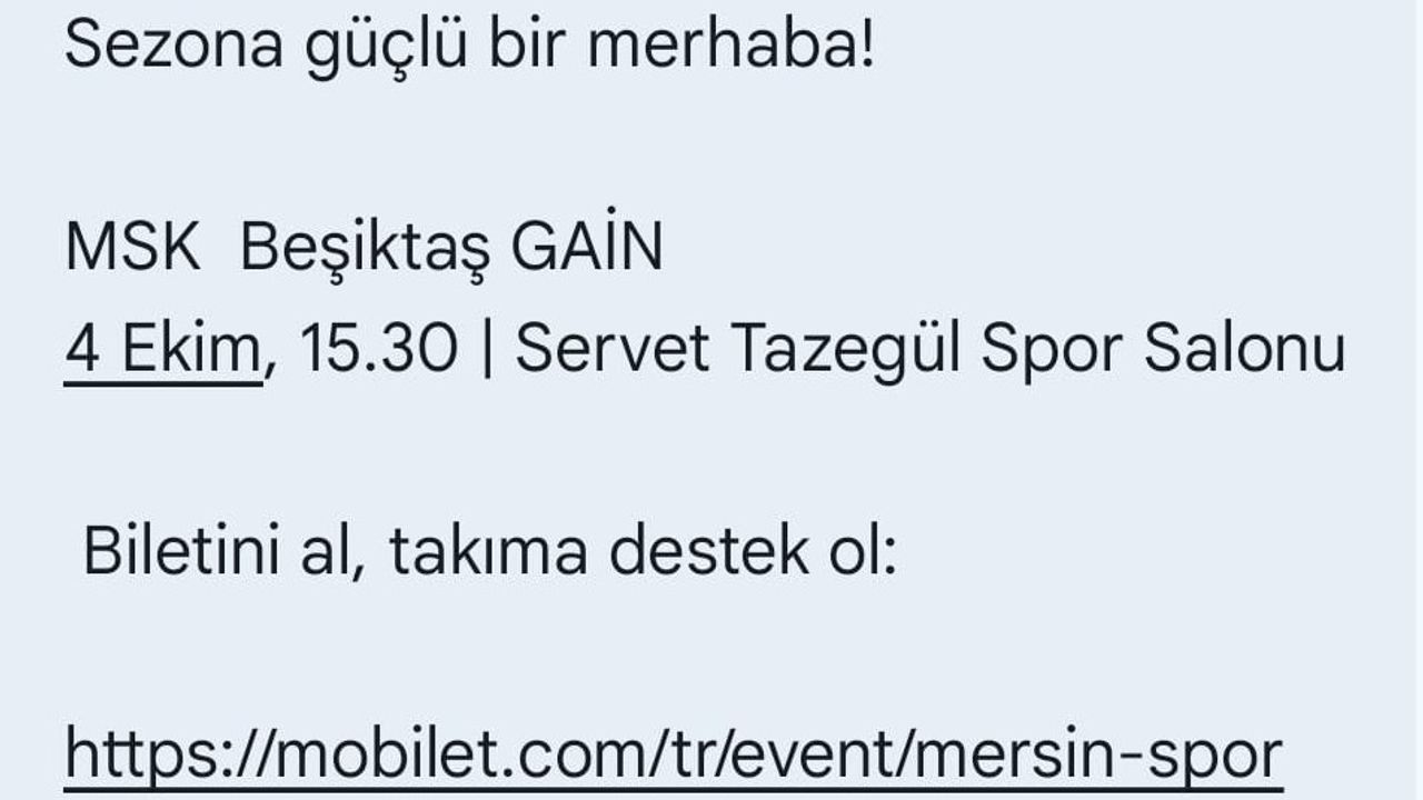 Sezona müthiş bir başlangıç yaparak gücünü kanıtlayan MSK'nın ligdeki iddiasını pekiştirmesi için Beşiktaş Gain maçı hayati önem taşıyor. Servet Tazegül Spor Salonu'nda oynanacak bu dev maçın biletleri satışa sunuldu. Mobil platformlar üzerinden 300 TL ile 7 bin 500 TL arasında değişen fiyatlarla satışa çıkan biletler, takıma hem maddi hem de manevi destek sağlamanın en somut yolu oldu.