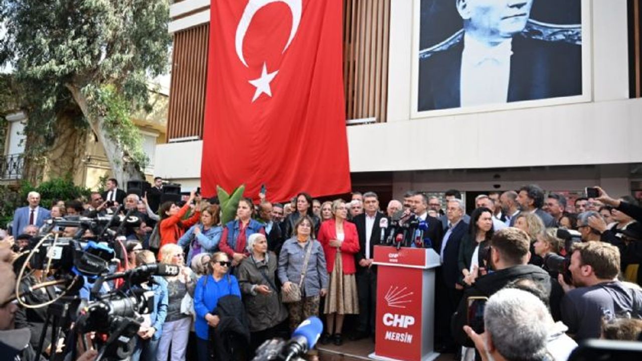 CHP Mersin İl Başkanı Koral Ömür, İstanbul Büyükşehir Belediye Başkanı İmamoğlu ve belediye çalışanlarının gözaltına alınmasının ardından parti binası önünde, partililerin de katılımıyla basın açıklaması yaptı.