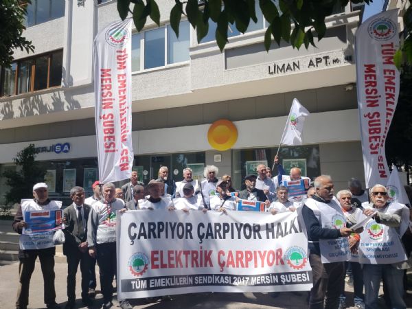 Mersin'de, son dönemdeki elektrik zamlarına karşı emekliler, Çamlıbel'deki elektrik dağıtım şirketi şubesinin önünde bir araya gelerek protesto düzenledi. Tüm Emekliler Sendikası Mersin Şubesi'nin çağrısıyla yapılan eyleme katılan emekliler, ellerinde dövizler ve çaldıkları düdüklerle, elektrik zammına karşı tepkilerini dile getirdi. Eylemciler, "Zam zulmü devam ediyor" sloganları atarak yetkililere seslerini duyurmaya çalıştı.