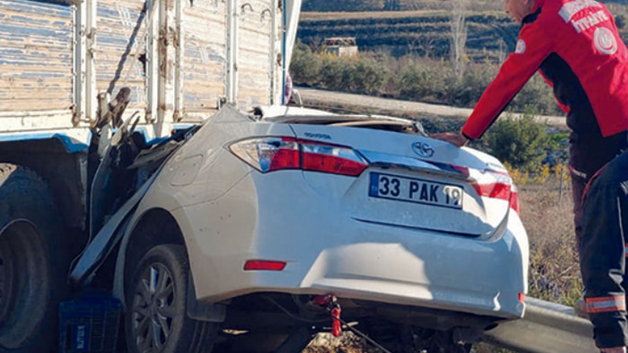 Edinilen bilgilere göre, Mersin- Çeşmeli Otoyolunun Karaisalı Mahallesi mevkiinde seyreden 58 yaşındaki Ramazan Kutan'ın kullandığı 63 LE 403 plakalı kamyon, önündeki araçtan düşen ağaç kütüğüne çarpmamak için manevra yaptı. Bir anda karşı yöne geçen kamyon, Semra Kaya Doğanay (42) yönetimindeki 33 PAK 19 plakalı otomobile çarptı. Çevredekilerin ihbarı üzerine kaza yerine çok sayıda 112 Acil Sağlık, polis ve itfaiye ekipleri sevk edildi. Olay yerine gelen ekipler, şarampole savrulan kamyon şoförü Kutan'ın cansız bedenini bularak tabuta koydu. Araçta sıkışan Kaya'nın cansız bedeni ise itfaiye ekiplerinin uğraşları sonucu çıkarıldı. Cenazelerin hastane morguna kaldırıldığı öğrenildi. (İHA)