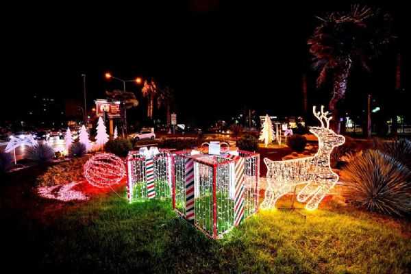 Mersin Büyükşehir Belediyesi kenti süsleyerek, ışıl ışıl ve estetik bir görüntü oluşturdu. Noel Baba, çam ağacı, geyikler, şeker, hediye kutusu ve ışıklı 2025 yazısı gibi yılbaşı konseptli ürünler, kentin işlek caddelerindeki kavşaklara yerleştirildi.