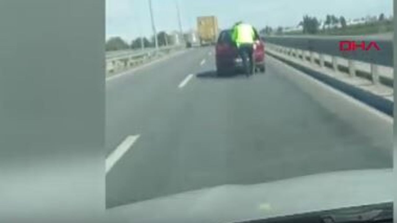 İlçedeki D-400 kara yolunda ismi öğrenilemeyen kadın sürücünün yönetimindeki otomobil, arıza yaparak durdu. Çevrede görev yapan bir trafik polisi, yol güvenliğini sağlamak için otomobili iterek üst geçidin sonuna ulaştırdı. Trafik polisinin aracı ittiğini gören diğer sürücüler, korna çaldı. O anlar çevredekiler tarafından cep telefonuyla görüntülendi.