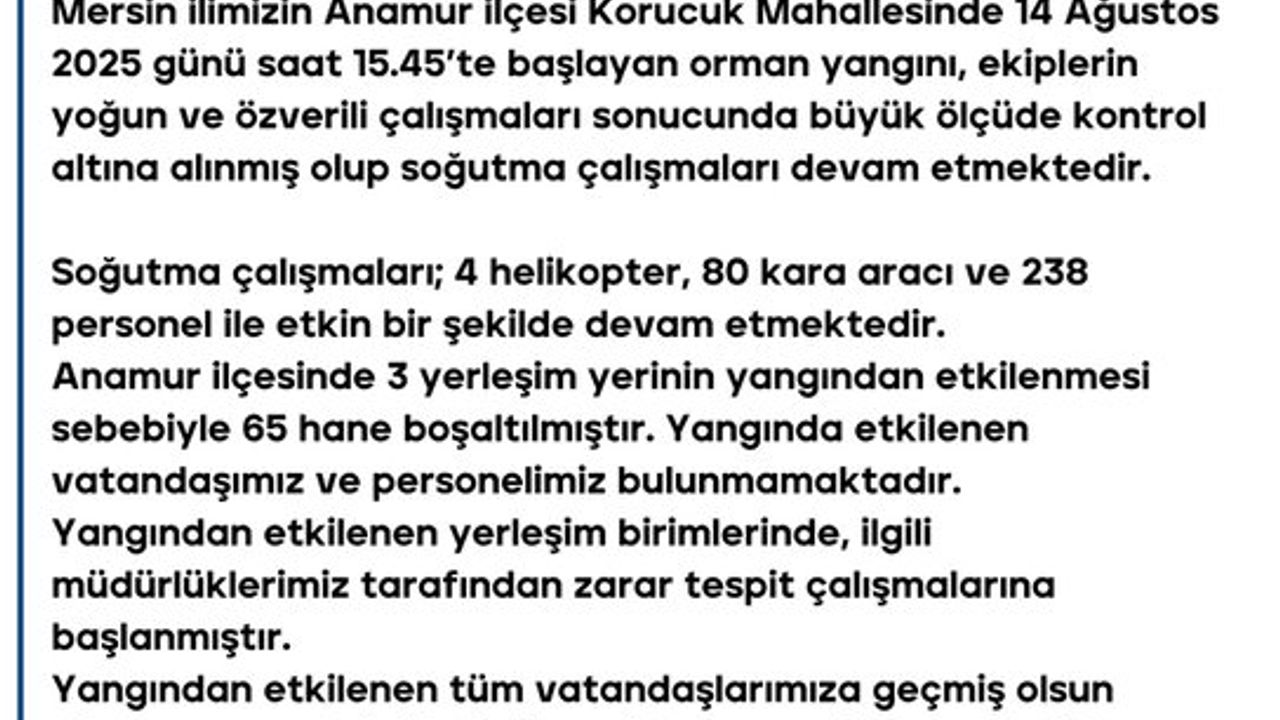 "Mersin ilimizin Anamur ilçesi Korucuk Mahallesinde 14 Ağustos 2025 günü saat 15.45’te başlayan orman yangını, ekiplerin yoğun ve özverili çalışmaları sonucunda büyük ölçüde kontrol altına alınmış olup soğutma çalışmaları devam etmektedir. Soğutma çalışmaları; 4 helikopter, 80 kara aracı ve 238 personel ile etkin bir şekilde devam etmektedir. Anamur ilçesinde 3 yerleşim yerinin yangından etkilenmesi sebebiyle 65 hane boşaltılmıştır. Yangında etkilenen vatandaşımız ve personelimiz bulunmamaktadır. Yangından etkilenen yerleşim birimlerinde, ilgili müdürlüklerimiz tarafından zarar tespit çalışmalarına başlanmıştır. Yangından etkilenen tüm vatandaşlarımıza geçmiş olsun diyor, yangına büyük bir özveriyle ve cansiperane şekilde müdahale eden tüm ekiplerimize, emekleri ve gayretli çalışmaları dolayısıyla şükranlarımızı sunuyoruz."