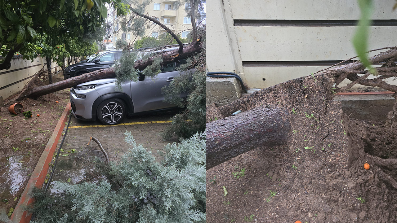 Yenişehir ilçesi 34. Cadde üzerinde bulunan bir sitenin açık otoparkında meydana gelen olayda, fırtınanın şiddetiyle kökünden sökülen büyük bir çam ağacı, park halindeki bir otomobilin üzerine devrildi.