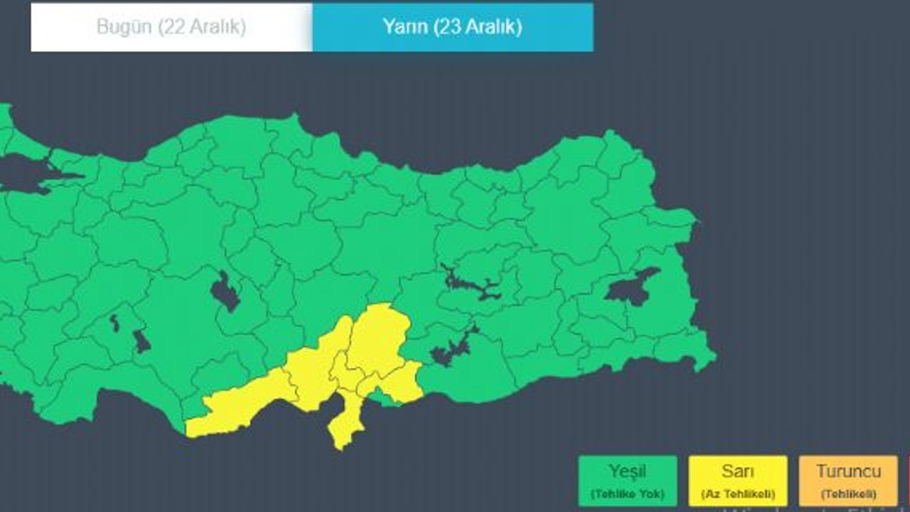 Meteorolojinin son verilerine göre; 23 Aralık 2024 Pazartesi günü Adana, Mersin'in doğusu, Osmaniye, Hatay, Gaziantep, Kahramanmaraş ve Adıyaman'da kuvvetli (21-50 kg/m2) sağanak, kıyı kesimlerde yer yer gök gürültülü sağanak yağış bekleniyor. Yağışların 1300-1400 metre rakım üzeri yükseklerde kuvvetli karla karışık yağmur ve kar şeklinde olacağı tahmin ediliyor.