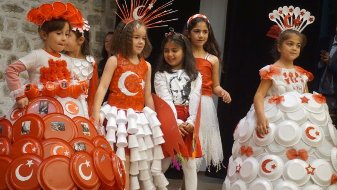 Minik bir öğrencinin Türk bayrağı motifli plastik tabaklardan yaptığı elbise ise büyük alkış aldı.