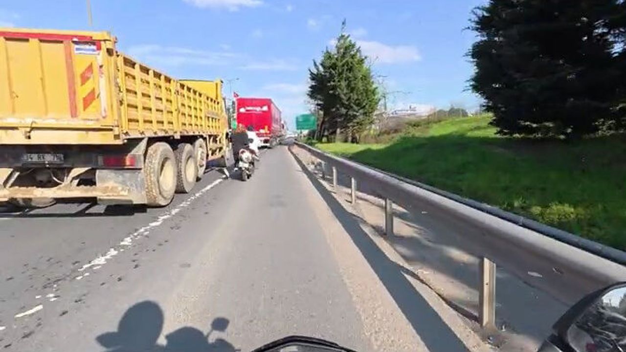 TEM Otoyolu'nda seyir halindeki motosiklet sürücüsü, arkasında oturan kadının saçını çekti. Motosikletteki kadın kavga sırasında dengesini kaybetti. Darbedilen kadının motosikletten düşmekten ve kamyonun altında kalmaktan kurtulduğu anlar başka bir motosikletlinin kask kamerasına yansıdı.