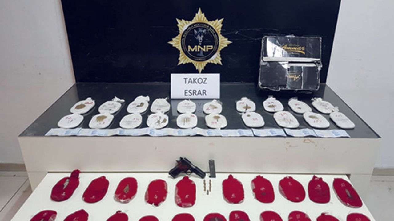 Mersin Emniyet Müdürlüğü Narkotik Suçlarla Mücadele Şube Müdürlüğü ekipleri, il genelinde uyuşturucu madde ticareti yapan şahısların suç unsurları ile birlikte yakalanmasına yönelik yaptıkları çalışmalar kapsamında Akdeniz'de bulunan bir ikamette Narkotik Madde Arama Köpeği Miror ile yapılan aramada, 41 paket halinde toplam 7 kilo 950 gram gelen takoz esrar maddesi ele geçirilmiş, olayın şüphelileri olan M.A.A ve S.H hakkında uyuşturucu veya uyarıcı madde imal ve ticareti suçundan gerekli yasal işlemlere başlanılmıştır. (Haber Merkezi)