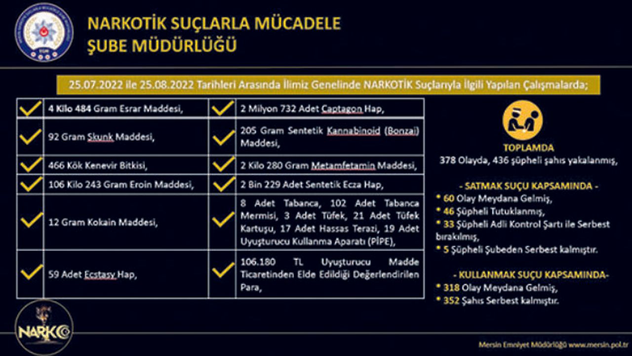 Uyuşturucu madde satmak suçu kapsamında 60 olay, uyuşturucu madde kullanmak suçu kapsamında 318 olay olmak üzere toplam 378 olay meydana gelmiş, 436 şahıs yakalanmış. Torbacı tabir edilen 46 şahıs tutuklandı. 33 şahıs adli kontrol şartıyla mahkemeden serbest kalmış. 5 şahıs şubeden serbest kalmıştır. Kullanıcı tabir edilen 352 şahıs şubeden serbest kalmıştır. Ele geçen suç unsurları şu şekildedir; esrar maddesi: 4 kilo 484 gram, skunk maddesi: 92 gram, kenevir bitkisi: 466 kök, eroin maddesi: 106 kilo 243 gram, kokain: 12 gram, ecstasy hap: 59 adet, captagon hap: 2 milyon 732 adet, sentetik kannabinoid (bonzai) maddesi: 205 gram, metamfetamin maddesi: 2 kilo 280 gram, sentetik ecza hap: 2 bin 229 adet, tabanca: 8 adet, tabanca mermisi: 102 adet, tüfek: 3 adet, tüfek kartuşu: 21 adet, hassas terazi: 17 adet, uyuşturucu madde kullanma aparatı (pipe): 19 adet, el konulan para: 106 bin 180 TL. (Haber Merkezi)