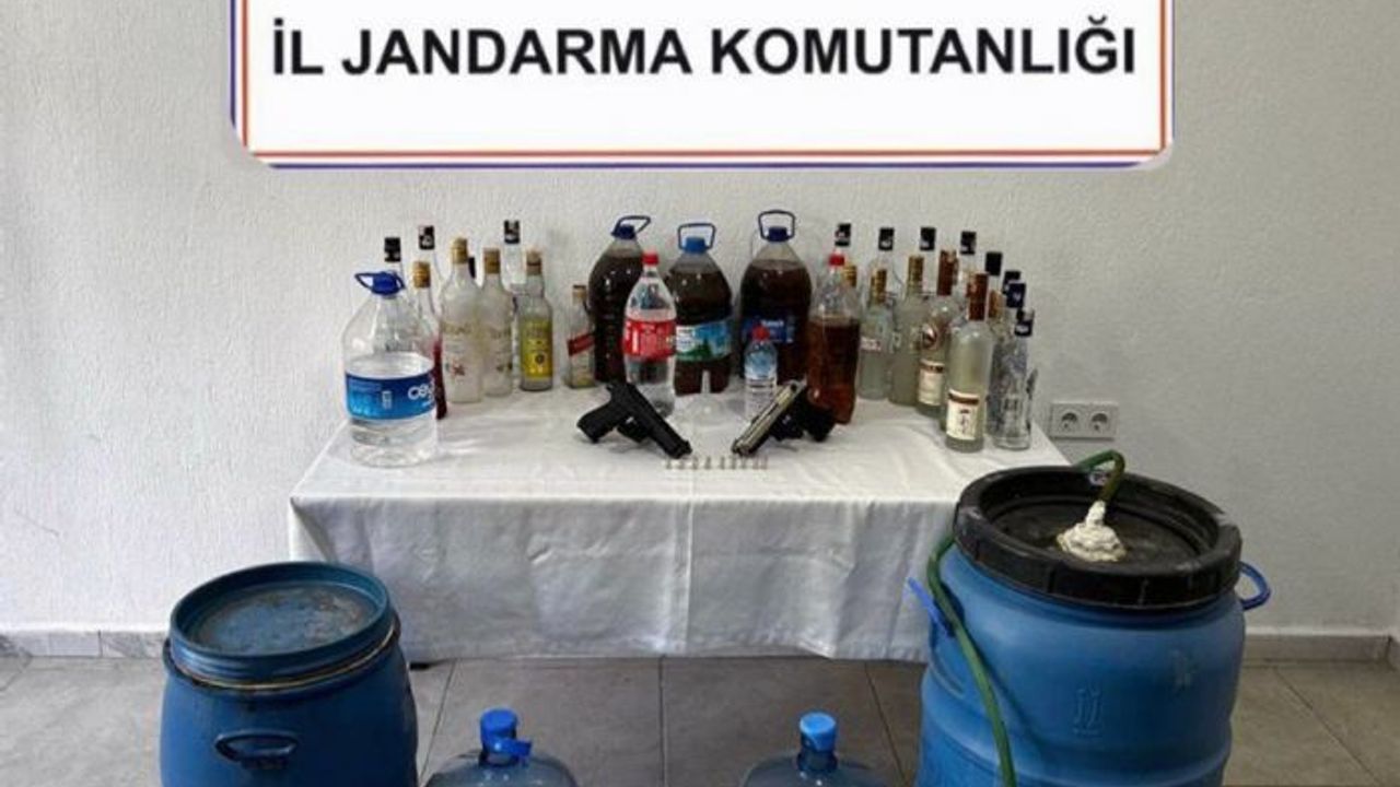 Yapılan aramada; 120 litre el yapımı şarap, 60 litre el yapımı fakı, 12 litre el yapımı viski, 9 litre el yapımı vokta, 5 litre etil alkol, 60 litrelik alkol damıtma bidonu, doldurma hunisi, 2 adet ruhsatsız kurusıkı tabanca, şarjör ve 9)adet ses fişeği ele geçirildi.