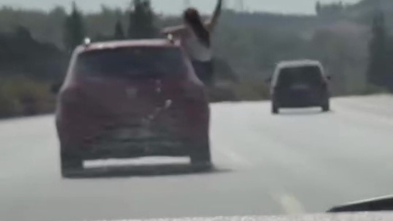 Adana TAG Otoyolu’nda ilginç ve tehlikeli bir an yaşandı. Cipte yolcu olarak bulunan bir kadın, aracın camından çıkarak kapısına oturdu. Ellerini açarak bir süre bu şekilde ilerleyen kadın, diğer sürücüleri korkuttu. O anlar, yoldan geçen bir başka sürücü tarafından cep telefonu kamerasıyla kaydedildi.