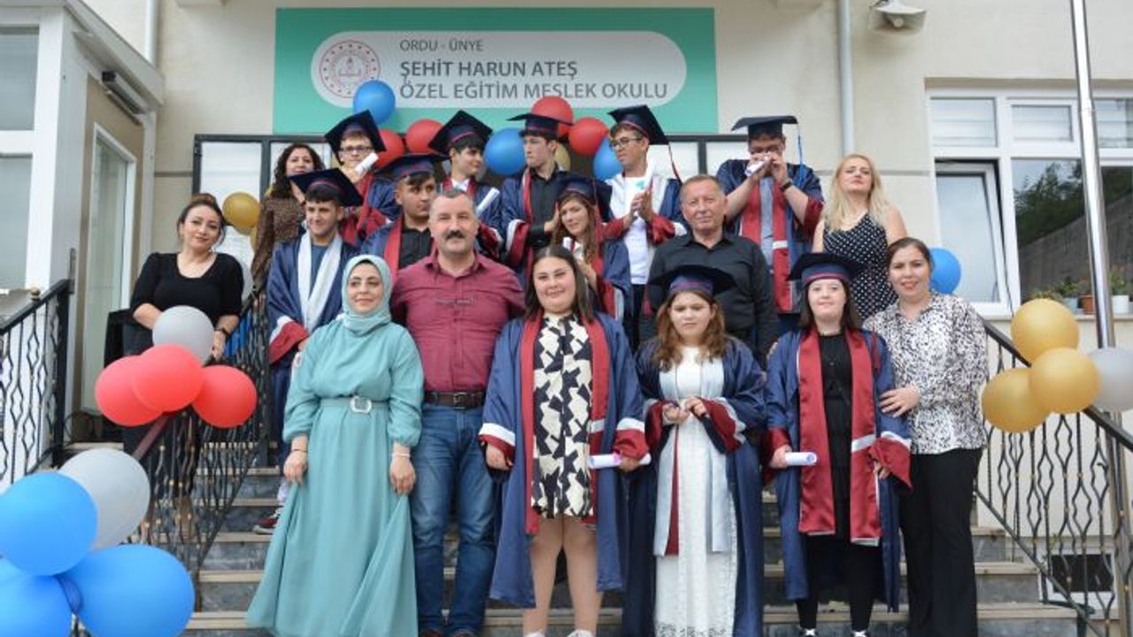 Ünye ilçesinde 2017 yılından bu yana hizmet veren, 5 ayrı bölümde 31 öğretmen ile toplam 80 öğrencinin eğitim aldığı Şehit Harun Ateş Özel Eğitim Meslek Okulu'nda son sınıfı bitiren 14 öğrenci için mezuniyet töreni gerçekleştirildi.