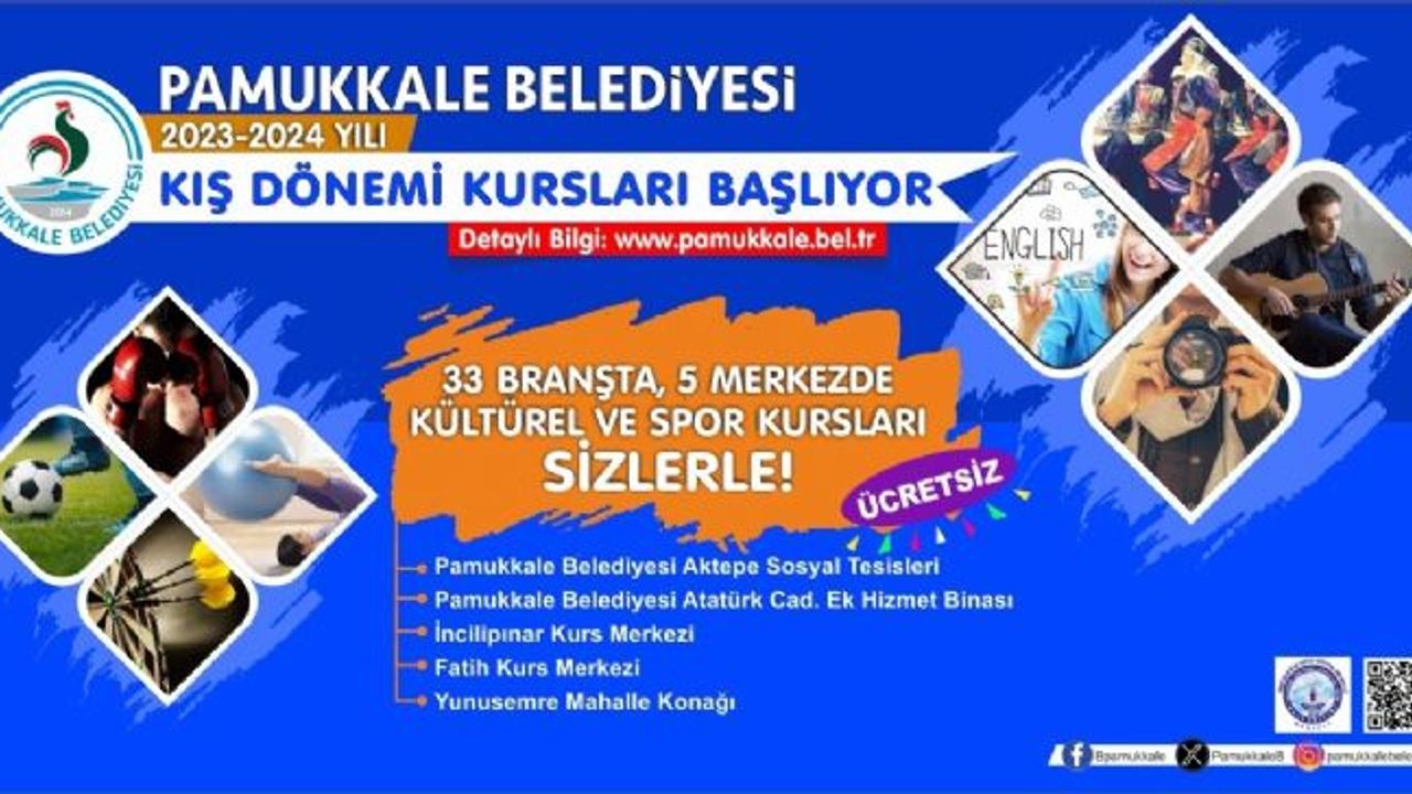 Her yıl hem spor hem de eğitici kültürel kurslar düzenleyen Pamukkale Belediyesi, 2023-2024 dönemi kış kurslarını 33 farklı alanda açıyor. Pamukkale Belediyesi Aktepe Sosyal Tesisleri, Atatürk Caddesi ek hizmet binası, İncilipınar Kurs Merkezi, Fatih Kurs Merkezi, Yunusemre Mahalle Konağı'nda gerçekleştirilecek olan kurslara yoğun talepler oluşurken kurslara kayıtlar hala devam ediyor. Pamukkale Belediyesi tarafından, kültürel kurslar çerçevesinde Almanca A1, İngilizce A1, bağlama, keman (08-16 yaş), gitar (16+ yaş üzeri), ebru, ahşap boyama, ekopsi kişisel ve dekorasyon ürün, kadınlar için el sanatları, amigrumi örgü, takı tasarım, makrome örgü yapımı, etkili ve hızlı okuma teknikleri (08-11 yaş), giyim teknolojileri, halk oyunları, işaret dili, satranç, zeka oyunları, akrilik boyama-resim, ney açılacak, temel fotoğrafçılık ve mobil fotoğrafçılık, ziraat ve diksiyon dallarında eğitimler verilecek. Ayrıca spor dallarından boks, karate, pilates, cimnastik, dart, judo, masa tenisi, okçuluk, futbol, tenis dallarında kurslar açılacak.