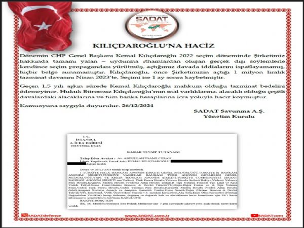 Açıklamada, "Dönemin CHP Genel Başkanı Kemal Kılıçdaroğlu 2022 seçim döneminde şirketimiz hakkında tamamı yalan, uydurma ithamlardan oluşan gerçek dışı söylemlerle kendince seçim propagandası yürütmüş, açtığımız davada iddialarını ispatlayamamış, hiçbir belge sunamamıştır. Kılıçdaroğlu, önce şirketimizin açtığı 1 milyon liralık tazminat davasını Nisan 2023'te, seçimi ise 1 ay sonra kaybetmiştir. Geçen 1,5 yılı aşkın sürede Kemal Kılıçdaroğlu mahkum olduğu tazminat bedelini ödemeyince, Hukuk Büromuz Kılıçdaroğlu'nun mal varlıklarına, alacaklı olduğu çeşitli davalardaki alacaklarına ve tüm banka hesaplarına icra yoluyla haciz koymuştur" denildi.