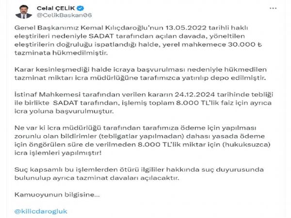 Kemal Kılıçdaroğlu'nun avukatı Celal Çelik de sosyal medya hesabından yaptığı açıklama ile söz konusu iddialara yanıt verdi. Çelik, "Genel Başkanımız Kemal Kılıçdaroğlu'nun 13 Mayıs 2022 tarihli haklı eleştirileri nedeniyle SADAT tarafından açılan davada, yöneltilen eleştirilerin doğruluğu ispatlandığı halde, yerel mahkemece 30 bin tazminata hükmedilmiştir. Karar kesinleşmediği halde icraya başvurulması nedeniyle hükmedilen tazminat miktarı icra müdürlüğüne tarafımızca yatırılıp depo edilmiştir. İstinaf Mahkemesi tarafından verilen kararın 24 Aralık 2024 tarihinde tebliği ile birlikte SADAT tarafından, işlemiş toplam 8 bin TL'lik faiz için ayrıca icra yoluna başvurulmuştur. Ne var ki icra müdürlüğü tarafından tarafımıza ödeme için yapılması zorunlu olan bildirimler (tebligatlar) yapılmadan, dahası yasada ödeme için öngörülen süre de verilmeden 8 bin TL'lik miktar için (hukuksuzca) icra işlemleri yapılmıştır. Suç kapsamlı bu işlemlerden ötürü ilgililer hakkında suç duyurusunda bulunulup ayrıca tazminat davaları açılacaktır" ifadelerini kullandı.
