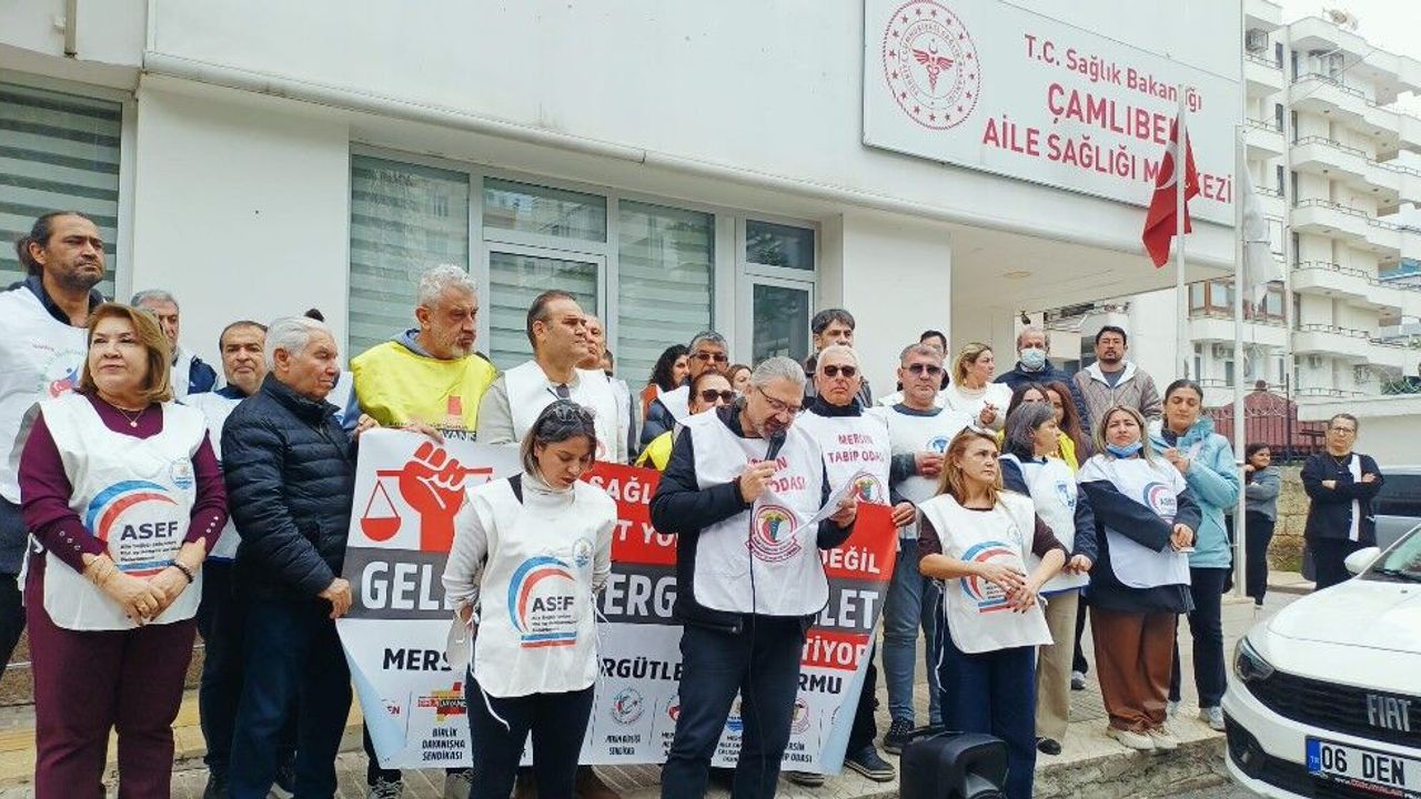 Çamlıbel Sağlık Merkezi önünde, Mersin Tabip Odası, Mersin Sağlık Örgütleri Platformu, Aile Hekimliği Çalışanları Sendikası (AHESEN), Birinci Basamak Sağlık Çalışanları Birlik ve Dayanışma Sendikası (BDS) ve Genel Sağlık ve Sosyal Hizmet Kolu Kamu Çalışanları Sendikası (Genel Sağlık-İş), Devrimci Sağlık İşçileri Sendikası, Hekim Birliği Sağlık ve Sosyal Hizmet Çalışanları Sendikası ile Mersin Aile Hekimleri Derneği’nin katılımıyla gerçekleşen eylemde, bir kez daha sağlık çalışanları haklarını istedi. Burada grup adına açıklama yapan Fatma Can, gelirde adalet, vergide adalet ve yeni yönetmeliğe karşı mücadelelerinin devam ettiğini vurgulayarak, “Bugün 25 Şubat 2026. Aile sağlığı merkezlerimizden gelirde ve vergide adalet talebimizin 15. ayındayız. Aile Sağlığı Merkezlerimizde, mahallemiz, çalışanlarımız, emeklilerimiz, işçilerimizle bir aradayız. Bugün Türkiye’nin dört bir yanındaki binlerce Aile Sağlığı Merkezleri vergi rekortmenleri ile dolup taştı. Bankalarda milyarlarca lirası olanlar değil, Türkiye’nin en büyük holdinglerinin en zengin patronları değil, asgari ücreti masada bahşiş olarak bırakanlar değil. Emeklilerimiz, işçilerimiz, asgari ücretle ayın sonunu değil ortasını getirmekte zorlanan vatandaşlarımız, biz Aile Hekimleri vergi rekortmeniyiz. Yoksulluk sınırının 100 bin liraya dayandığı ülkemizde toplam geliri 400 bin lira olan çalışandan yüzde 25 vergi kesiliyor. Milyarderler çeşitli yollarla vergi ödemezken, faizle günde 100 bin lira kazananlardan yüzde 15 vergi kesilirken yoksulluk sınırının altına mahkum edilmiş Aile Sağlığı ebe hemşireleri 2 ay sonra yüzde 20, 6 ay sonra yüzde 27 vergi ödemeye başlayacak. Anormal vergi kesintileri ile ocak ayı zammı mart ayında kaybolacak ve her ay daha fazla vergi ödemeye ve düşük ücret almaya devam edeceğiz” dedi.