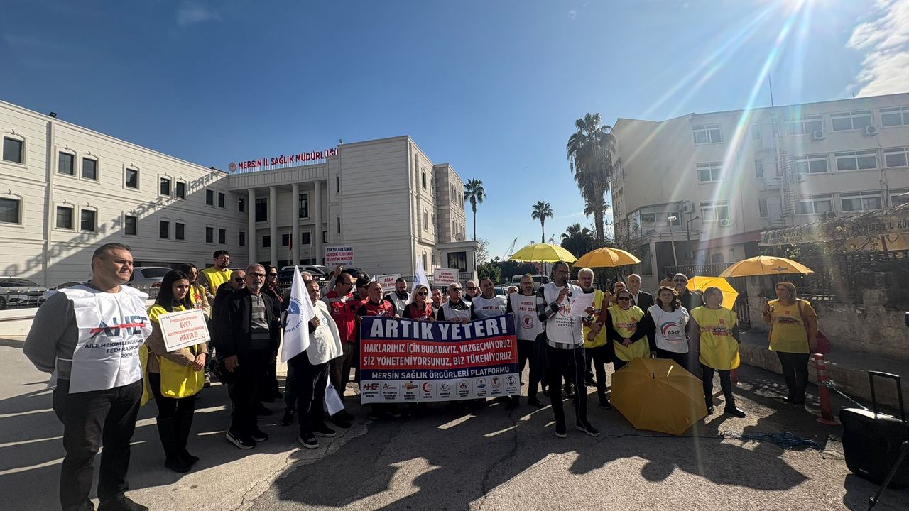 Mersin İl Sağlık Müdürlüğü önünde bir araya gelen sağlık çalışanları, tepkilerini dile getirdi. Ellerindeki dövizler ile attıkları sloganlarla tepkilerini dile getiren sağlık emekçileri, haklarının verilmesini istedi. Aile Hekimleri Dernekleri Federasyonu (AHEF), Aile Hekimliği Çalışanları Sendikası (AHESEN), Birinci Basamak Sağlık Çalışanları Birlik ve Dayanışma Sendikası (BDS), Genel Sağlık ve Sosyal Hizmet Kolu Kamu Çalışanları Sendikası (Genel Sağlık-İş), Hekim Birliği Sağlık ve Sosyal Hizmet Çalışanları Sendikası (Hekim Birliği), Mersin Aile Hekimleri Derneği (MAHDER), Mersin Aile Sağlığı Çalışanları Derneği (MASÇAD), Mersin Tabip Odası ile Sağlık ve Sosyal Hizmet Emekçileri Sendikası'nın (SES) destek verdiği eylemde konuşan Doktor İbrahim Önge, son bir yılda, aile sağlığı merkezlerine gelmeyen kayıtlı nüfus üzerinden ücret katsayıların düşürüldüğünü, objektif kriterlere dayanmayan memnuniyet uygulamaları nedeniyle hekim, ebe ve hemşirelerin kendi kontrollerinde olmayan nedenlerle gelir kesintileriyle karşı karşıya bırakıldığını belirterek, "Günlük yoğun poliklinik yüküne rağmen bizlerden binlerce veri girişi, telefon takibi ve idari işlem beklenmekte koruyucu hekimliğe ayrılan zaman giderek azalmaktadır. Ücretlerimizin önemli bir kısmı öngörülemez performans kriterlerine bağlanmış, hastalık ve izin gibi en temel insani durumlarda dahi ciddi gelir kayıpları oluşmuştur. Aile hekimliğinde taban ödeme oranı yüzde 35 iken, ikinci ve üçüncü basamakta bu oran yüzde 72 seviyelerindedir. Daha önce 'nüfus düzenlemesiyle ücretler düşmeyecek' denmesine rağmen sahada bunun karşılığı görülmemiş, katsayılar artırılmak yerine kesinti doğuran yeni kriterler devreye alınmıştır. Kamuda çalışan hekim, ebe ve hemşirelerin yüksek vergi yükü de bu kayıpları ağırlaştırmaktadır. Ayrıca aile hekimliklerine, hakkında arama kararı bulunan veya uzun süredir başvurmayan kişilerin bulunması gibi kolluk kuvvetlerinin sorumluluğundaki süreçlerin sonuçları üzerinden gelir kesintisiyle sorumluluk yüklenmektedir. Bizler hekimlik, ebelik ve hemşirelik yapmak istiyoruz, hafiyelik değil. Ücret vermek değil, ücret kesmek üzerine kurguladığınızı görüyor ve bunu kabul etmiyoruz" dedi.