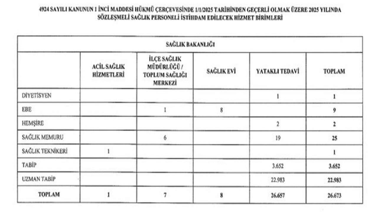 1 diyetisyen, 9 ebe, 2 hemşire, 25 sağlık memuru, 1 sağlık teknikeri, 3 bin 652 tabip, 22 bin 983 uzman tabip olmak üzere toplamda 26 bin 673 sağlık personeli sözleşmeli olarak istihdam edilecek.