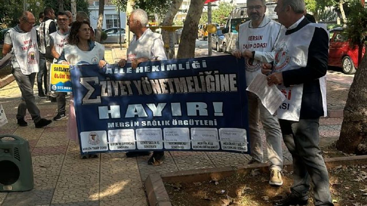 Mersinli sağlıkçılar adına basın açıklamasını okuyan Hekim Birliği Sendikasından Dr. İbrahim Ethem Kerem, "Eziyet yönetmeliğini dayatanlar, vergide adaleti sağlamayanlar, yönetemeyenler istifa etmelidir" dedi.