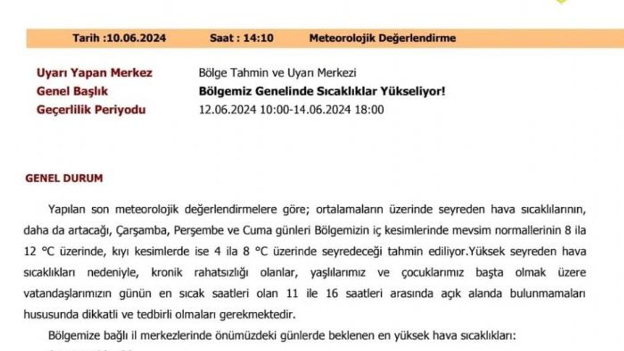 Vatandaşlara tedbirli olmaları yönünde uyarıda bulunularak, "Yüksek seyreden hava sıcaklıkları nedeniyle, kronik rahatsızlığı olanlar, yaşlılarımız ve çocuklarımız başta olmak üzere vatandaşlarımızın günün en sıcak saatleri olan 11 ile 16 saatleri arasında açık alanda bulunmamaları hususunda dikkatli ve tedbirli olmaları gerekmektedir" ifadelerine yer verildi.