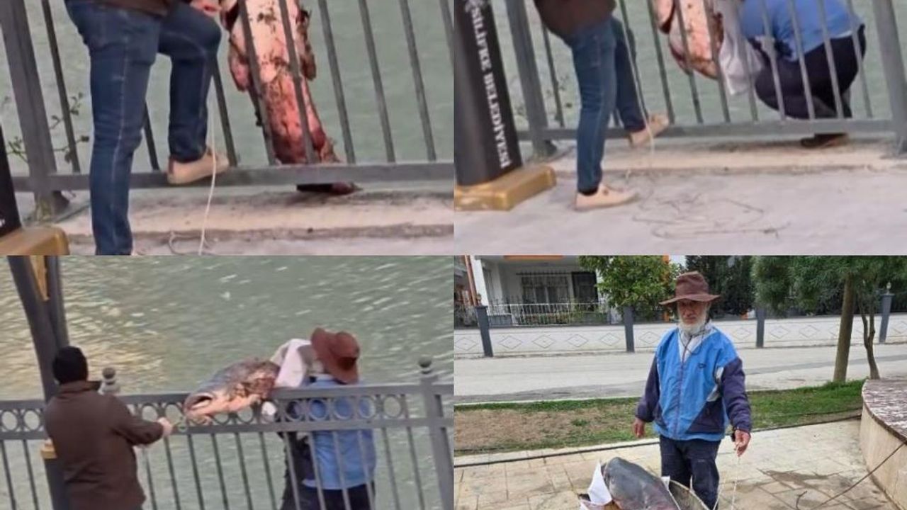 Görüntülerde, balıkçının yakaladığı dev yayın balığını, nehir kenarında güvenlik amacıyla bulunan demir bariyerin arkasından kontrol altına almaya çalıştığı, bir başka vatandaşın ise bariyerin ön tarafından balığa bağlanan ipi çekerek kıyıya çıkarmaya yardım ettiği anlar yer aldı.