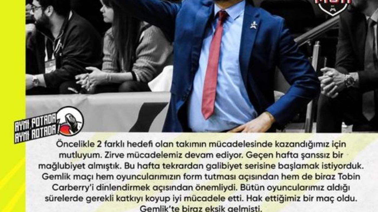 Liderliği kaptırdığı Çağdaş Bodrum Spor Kulübü'nün haftayı mağlubiyet ile kapatmasından sonra, MSK'nın haftayı kayıpsız geçmesi ligde tekrar zirvenin sahibi olmuştu. MSK, Bodrum ile puanları eşitledi ve şampiyonluğun yine en büyük favorilerinden biri olan carettaların Başantrenörü Semih Soğuksu, maçı değerlendirdi. MSK'nın sosyal medya hesaplarından yapılan değerlendirmede Soğuksu, "Öncelikle 2 farklı hedefi olan takımın mücadelesinde kazandığımız için mutluyuz. Zirve mücadelemiz devam ediyor. Geçen hafta şanssız bir mağlubiyet almıştık. Bu hafta tekrardan galibiyet serisine başlamak istiyorduk. Gemlik maçı hem oyuncularımızın form tutması açısından hem de biraz Tobi Carberry'i dinlendirmek açısından önemliydi. Bütün oyuncularımız aldığı sürelerde gerekli katkıyı koyup iyi mücadele etti. Hak ettiğimiz bir maç oldu. Gemlik'te biraz eksik gelmişti. Onlara da Türk basketboluna verdiği katkıdan dolayı teşekkür ediyorum" ifadelerine yer verdi.